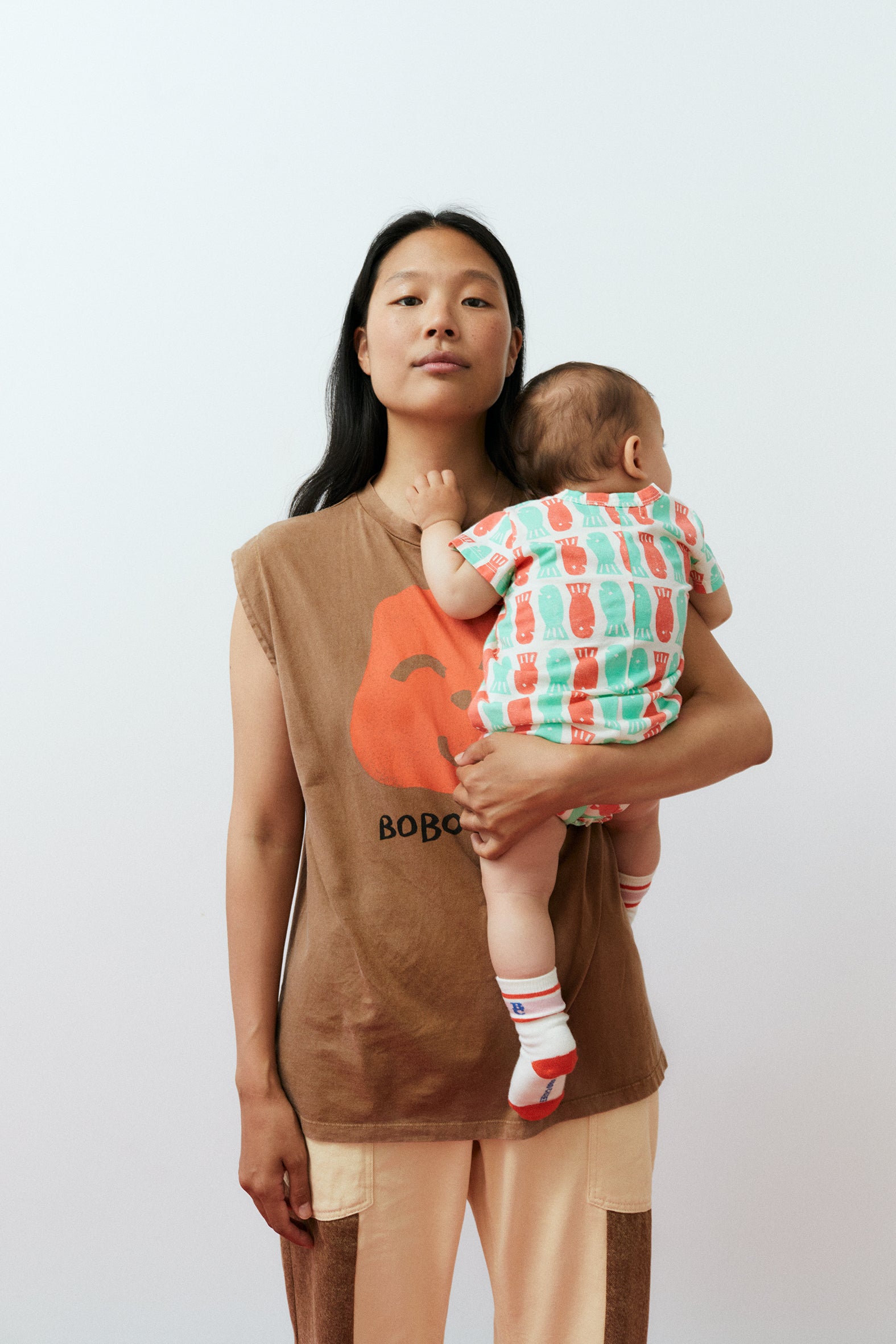 Confeccionado con un 95 % de algodón orgánico y un 5 % de elastano, presenta mangas cortas, tiro estándar y cierre a presión en el hombro y la entrepierna, para que sea fácil de poner y quitar.